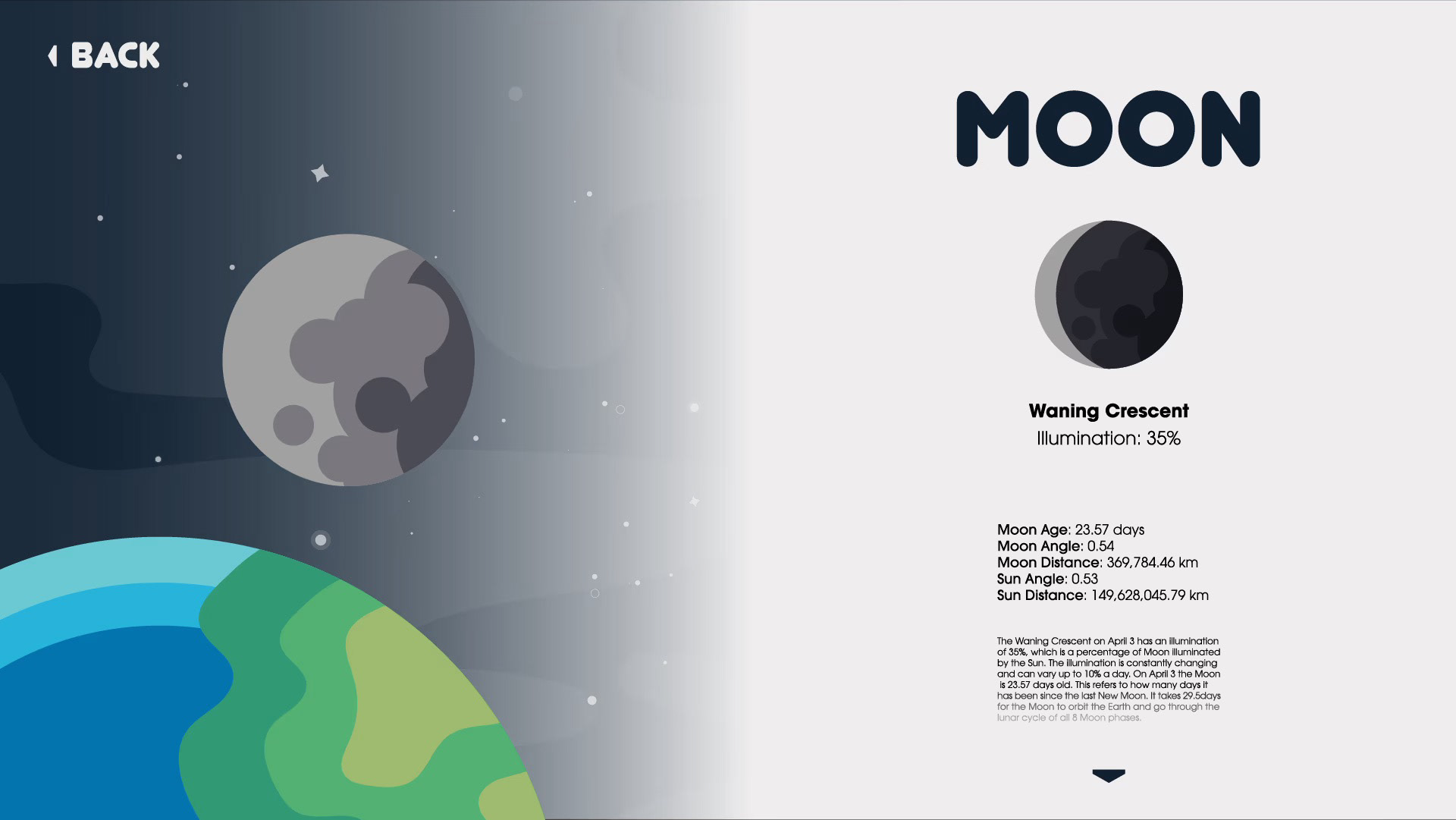 As a hobbyist stargazer, I often check the positions of planets and the moon’s phase before heading out with my telescope. I found that most existing astronomical information sites lack readability and user-friendly design, which led me to create this platform. Users can click on each planet to see how it appears from Earth on a selected date, along with visibility times and basic details—all presented in a clear, accessible interface.